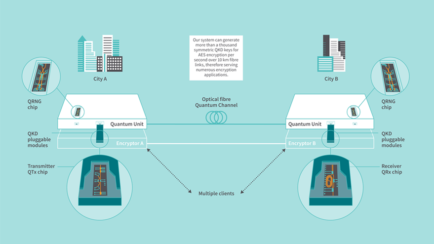 By using commercial fabrication techniques, we develop high performance photonic chips implementing the core QKD function. This is combined with drive electronics that allows the quantum transmitter and receiver chips to exchange photonic qubits in real time.